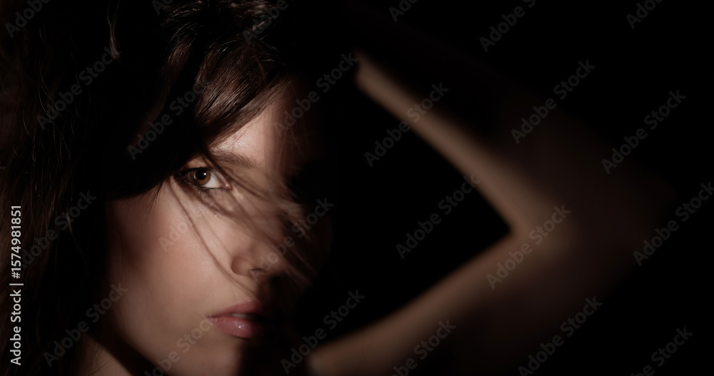 Close up portrait of mysterious young woman with brown hair covering part of her face with arm in dark room