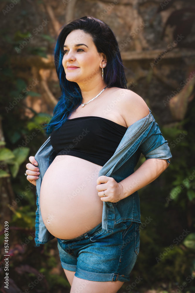 pregnant woman with exposed belly, colored hair, outdoors in jeans and black top.