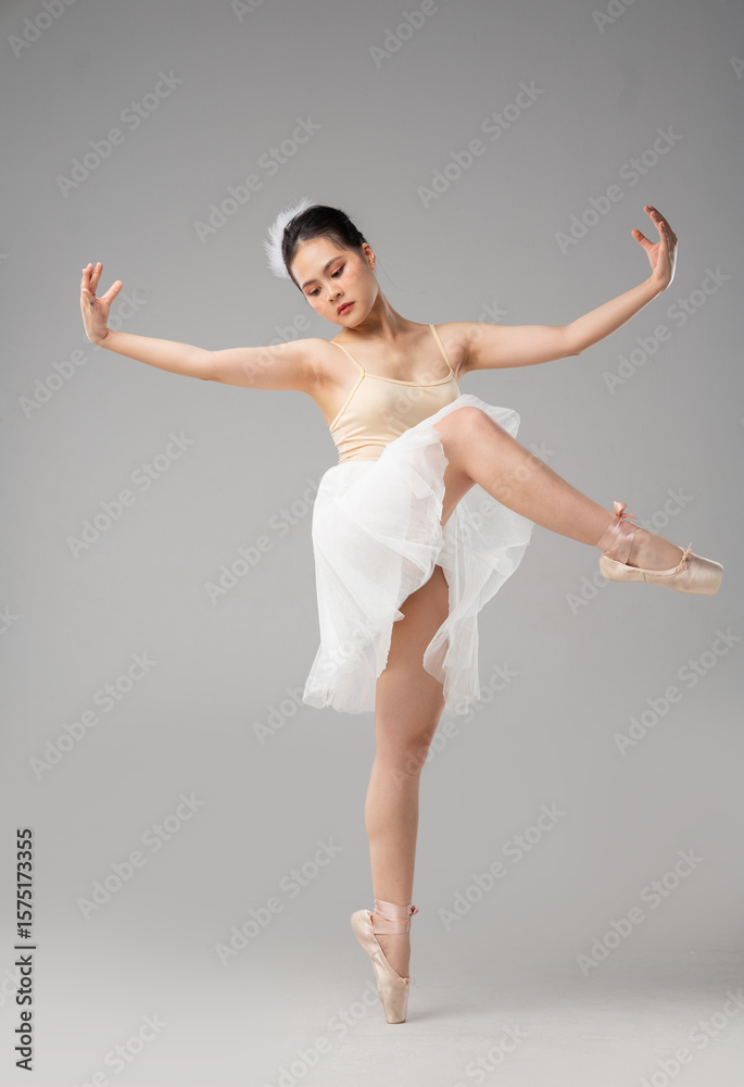 Graceful ballerina in white tutu poses en pointe against a soft grey backdrop with arms extended