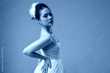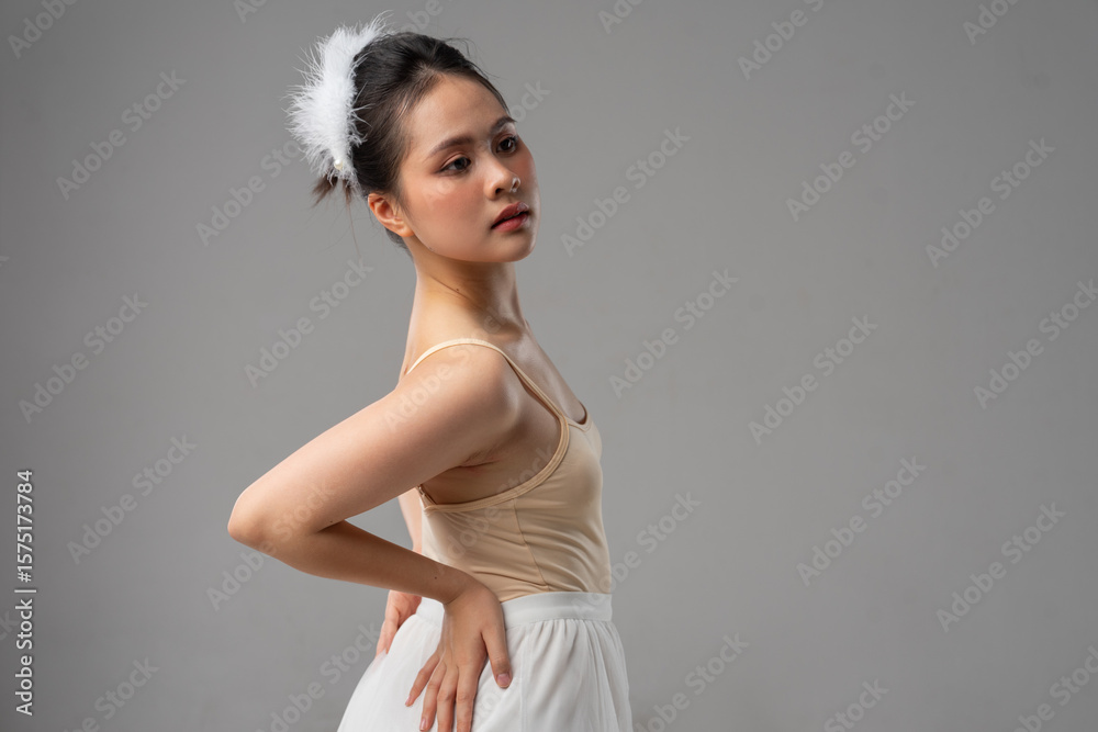 Graceful ballerina posing in a beige leotard and white tutu with feathered hairpiece looking up