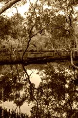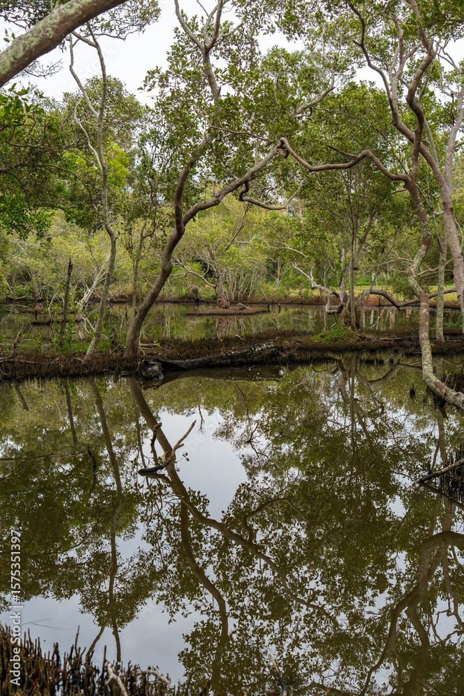 Mangrove trees reflected in wetland ponds on the Coochiemudlo Island golf course. Queensland, Australia