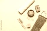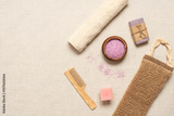Bathing accessories, towel, washcloth, soap, salt, on beige linen background, top view, flat lay