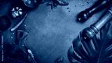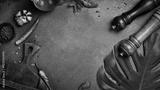 Stone black cooking background. Kitchen board with vegetables and spices. On a black stone background. Top view