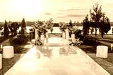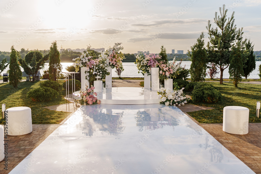 a path to the area of a wedding ceremony on the banks with columns and flowers.