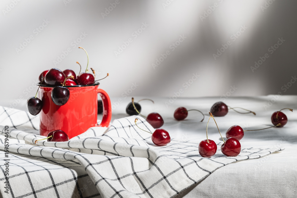 A red mug with ripe red cherries on a checkered napkin. Selective focus.