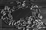 Invitation, greeting card or certificate mockup against the background of spent cartridges.
