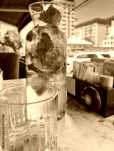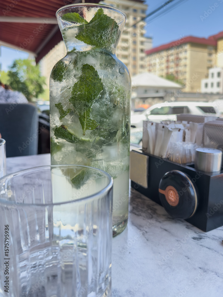Lemonade in a carafe on a table in a cafe. Selective focus.