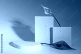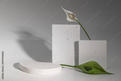Minimalistic eco-friendly postcard, product presentation, platform with spathiphyllum flower and plaster molds.