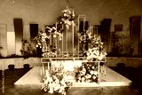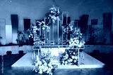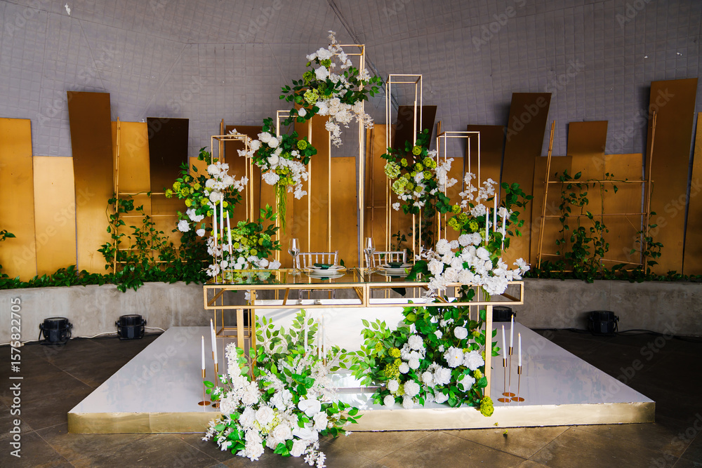 the table of the bride and groom decorated with flower arrangements.