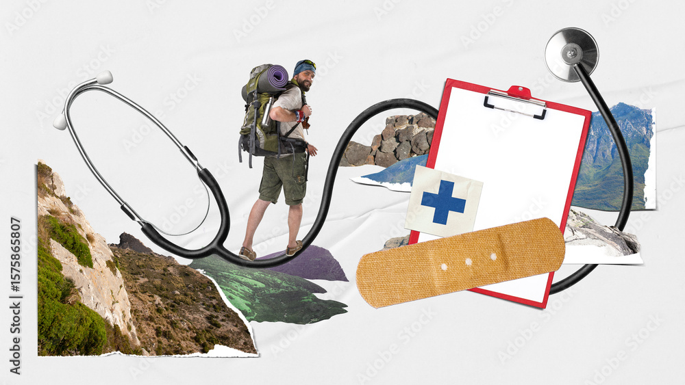 Collage with backpacker surrounded by stethoscope, medical supplies and mountain landscape fragments. Concept of travel safety, wilderness first aid, adventure risk awareness, health insurance