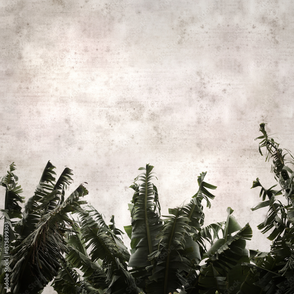 textured stylish old paper background, square, with banana plants with leaves torn into strips by winds