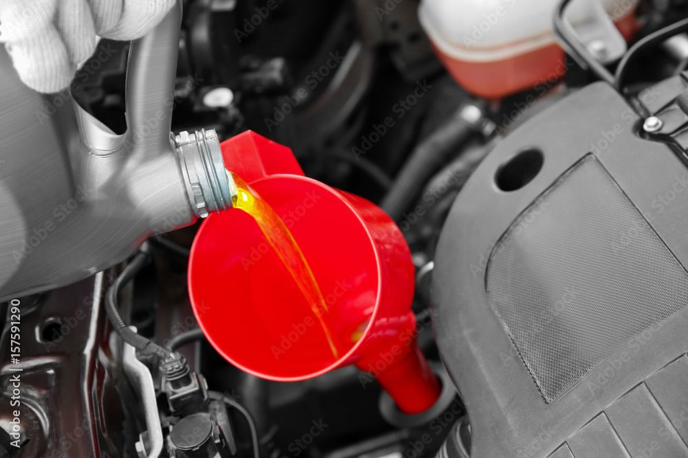 Engine oil pouring from canister, closeup