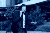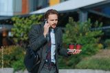 Business guy hustling downtown, coffee cups in hand, talking on phone