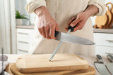 Man sharpening knife with sharpener at beige table indoors, closeup