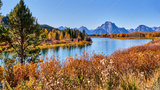 A beautiful and colorful fall scene along the water's edge with the background of the grand teton mountains