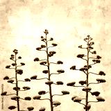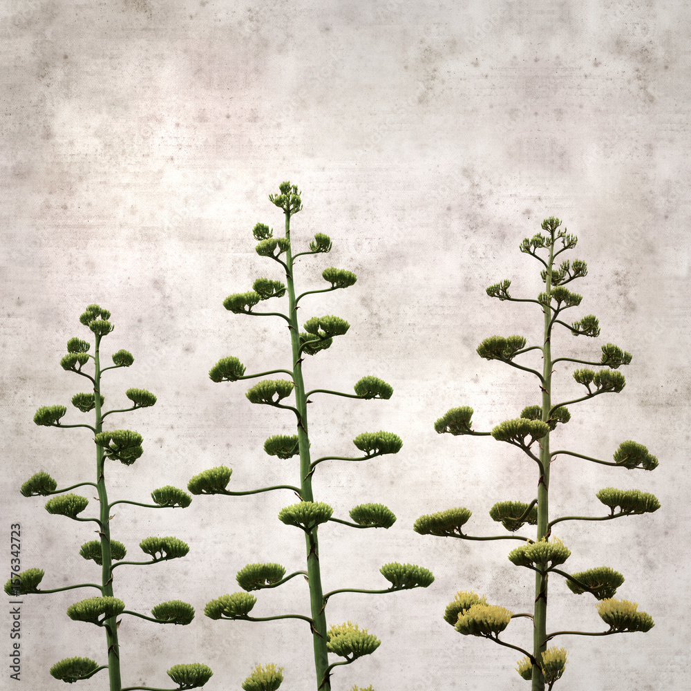 textured stylish old paper background, square, with tall inflorescences of Agave americana, sentry plant