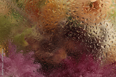 Smoke soft focus flower bouquet through glass with wet water drops. Abstract natural blur gradient background.