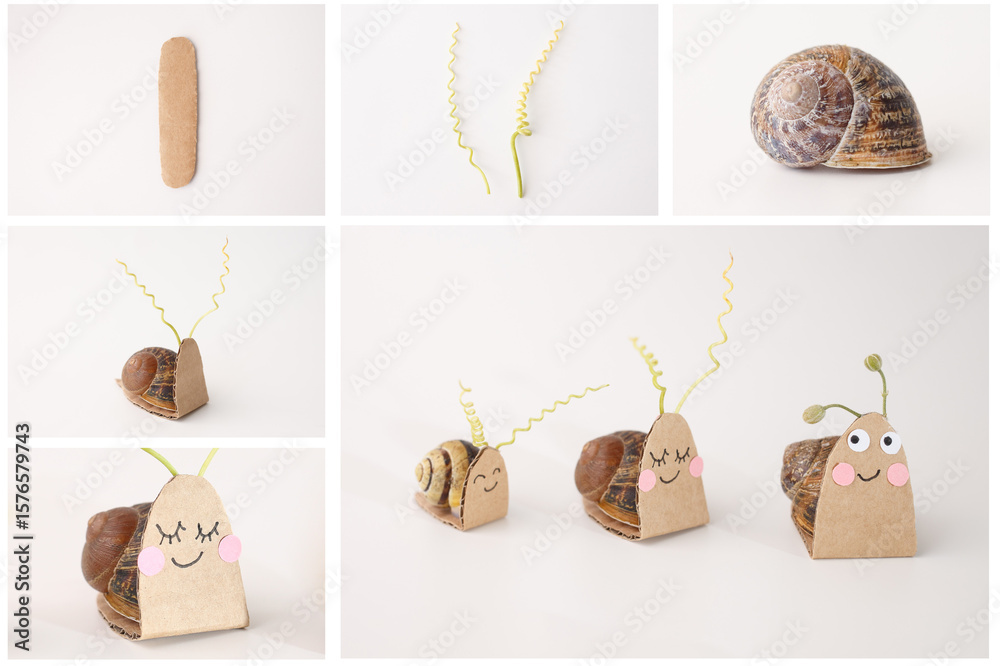 Handmade snail shell decorations for eco education, science workshops, children crafts, homeschooling content, environmental campaigns, nature learning kits, toy packaging visuals,