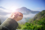 Rosary in hand with light and mountain view in the morning. Person hold catholic rosary with Jesus Christ holy wooden cross on a foggy morning over mountains. Faith and surrender to God concept.