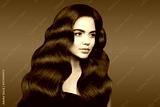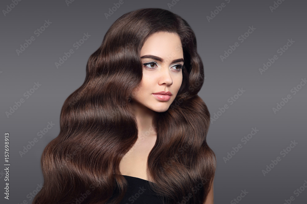 Healthy hair. Beautiful Brunette girl portrait with long shiny wavy hair. Attractive model with curly hairstyle and fresh makeup isolated on studio dark background. Shampoo care product.