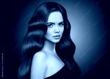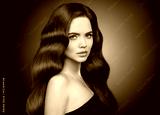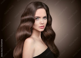 Healthy hair. Beautiful Brunette Girl portrait. Healthy Long wavy hairstyle. Beauty makeup. Model Woman advertising shampoo & skin care isolated on studio dark background.