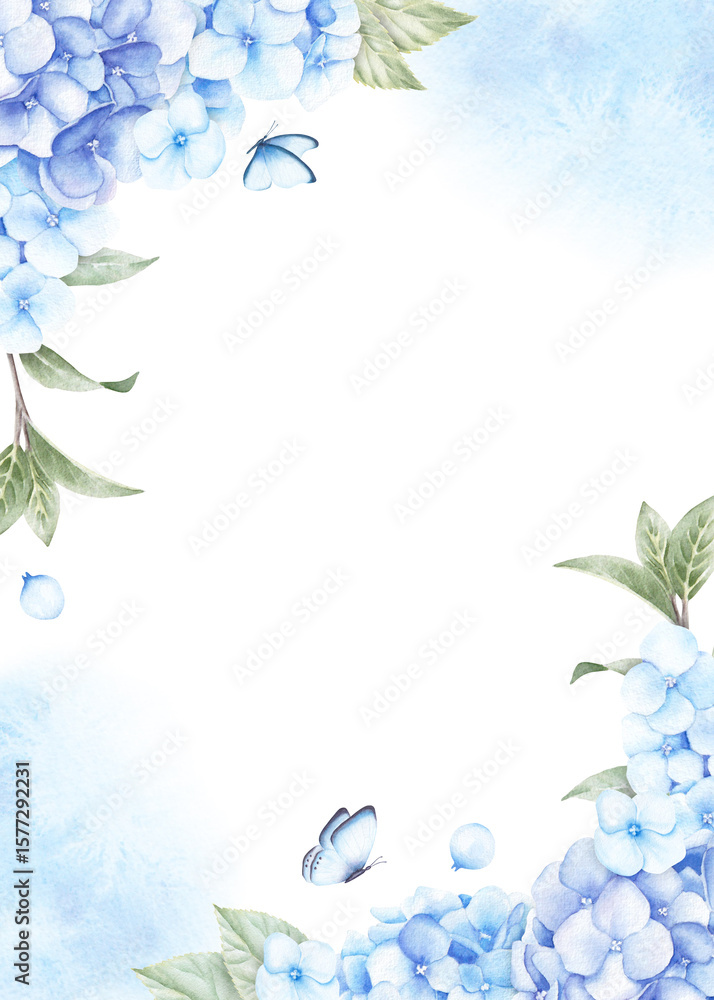 Greeting card template with hydrangea flowers, leaves, butterflies and blue spots. Watercolor hand drawn illustration isolated on white background