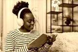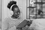 African American young adult woman reading novel at home. Sitting on sofa, wearing headphones, enjoying music, immersed in book. Relaxed atmosphere, quiet space. Living room interior, indoor leisure.