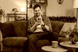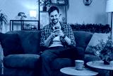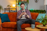 Happy young man in casual clothes thinking and text messaging on smartphone. Caucasian guy sitting on sofa and using mobile phone in living room at home. Male is watching online movie in apartment.