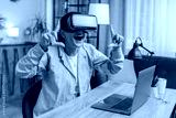 Surprised Indian woman freelancer testing VR headset while sitting at home office table. Young businessman girl making presentation using new gadget during remote working online at home. Lifestyle.