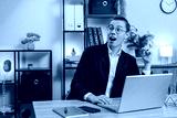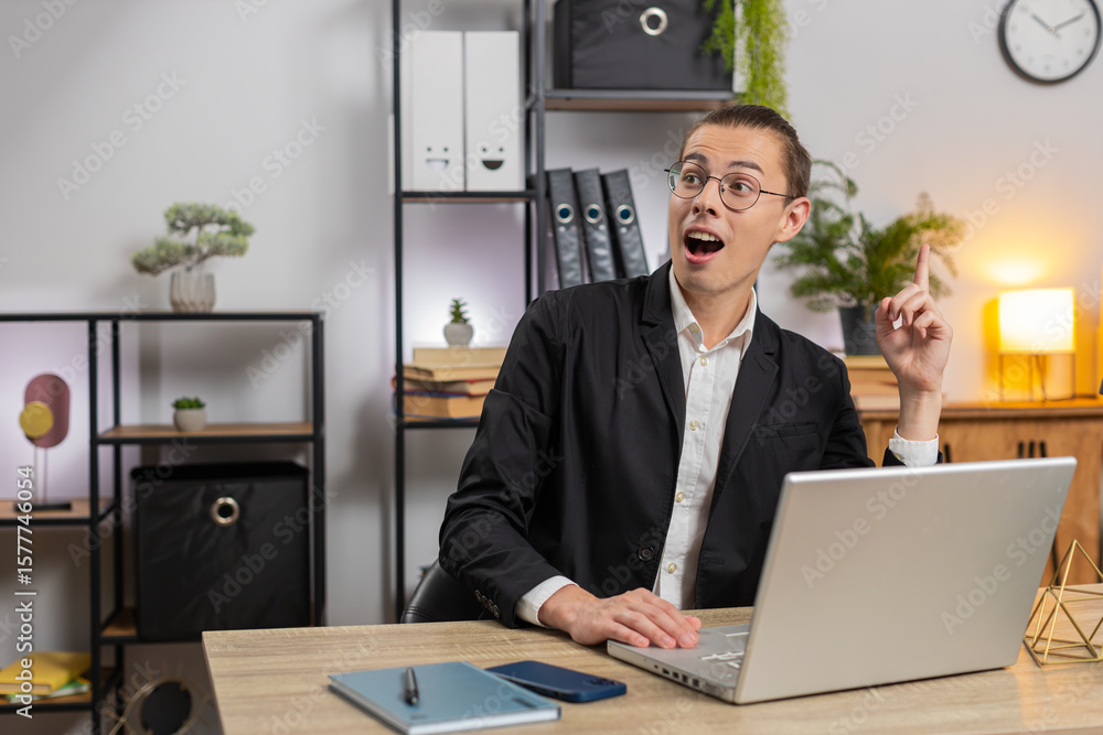 Smiling young Caucasian man freelancer thinking finding a good idea typing on laptop. Professional businessman writing important email from home at table. Happy guy working online remote distance job