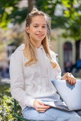 Woman freelancer sitting in city street closes laptop screen finishing working online distant job browsing website chatting, looking at camera. Girl using notebook, sends messages, watching movie.