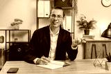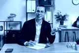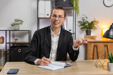 POV shot of young businessman freelancer looking to camera listening to colleague talking writing down on diary in video chat at home office. Stylish guy in suit taking notes at table. Web cam view.