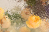 Smoke soft focus yellow anemone flower bouquet through glass with wet water drops. Abstract natural blur background.