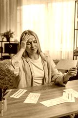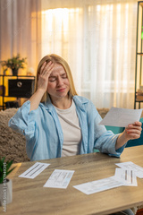 Young woman checks statement at home, eyes widening with alarm over unexpected expense. Girl sits at table sets paper aside, revealing tense realization of higher than normal cost of utility services