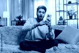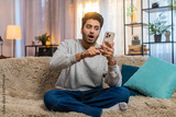 Happy young Indian man using smartphone scrolls through the news on smartphone reacting with surprise excitement wow. Hispanic male guy in casual clothes sitting on sofa couch in living room at home.