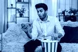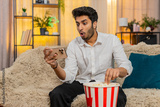 Indian man on home sofa eating popcorn while watching a video on smartphone, fully engaged in content. Arabian guy enjoying relaxation immersed in digital entertainment experiencing fun and excitement