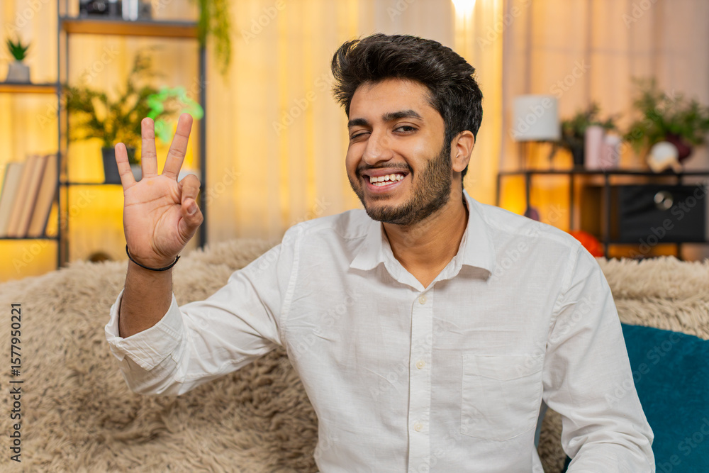 Indian young man at home confidently smiling and showing an OK hand gesture, expressing approval. Arabian guy sitting on sofa, nodding with satisfaction, giving a positive reaction to something good