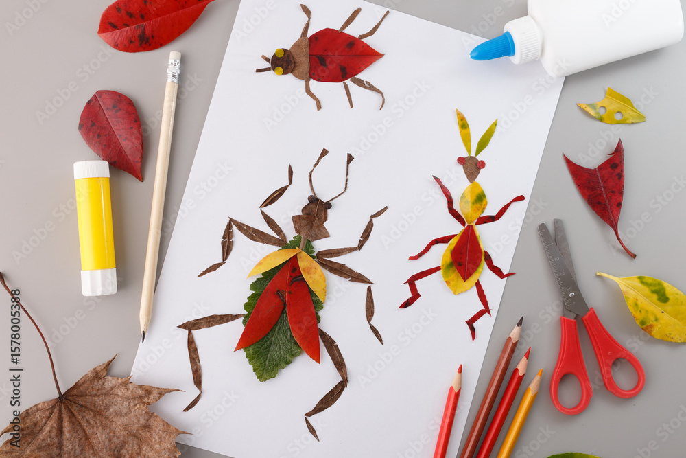 Handmade insect collages from autumn leaves and paper on a grey background. Flat lay with scissors, glue stick, and dried leaves. Great for schools, children's activities, and craft businesses