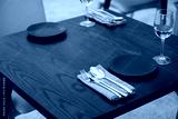 High angle view of eating utensils by wineglasses on table