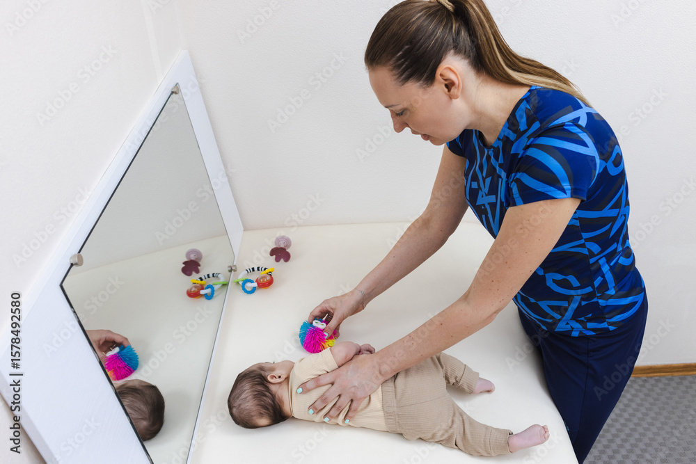 Child learning to roll over with guided support from physical therapist