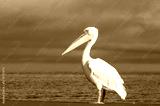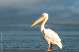 A single African great white pelican stands peacefully in a blue lagoon under soft natural light. A calm wildlife scene capturing elegance, balance, and the beauty of birdlife in Africa.