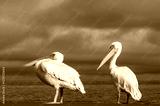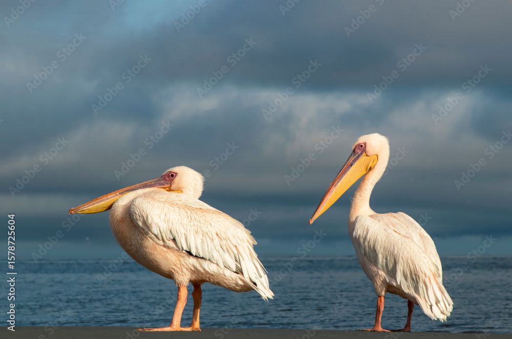 Two African great white pelicans stand side by side in a calm blue lagoon under soft light. A peaceful wildlife scene showing harmony, grace, and the natural beauty of wetland birds.