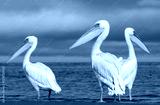 Group of African great white pelicans standing calmly in a blue lagoon under natural light. A peaceful wildlife scene reflecting the grace, balance, and beauty of wetland birdlife in Africa.