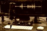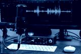 Professional black condenser microphone setup in a home audio studio, with digital sound waveforms displayed on a computer screen for podcast and music production