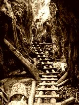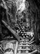 Wooden steps path in Tatra mountain forest - Slovensky Raj Sucha Bela trail, dark dry canyon in forest, adventure vibe