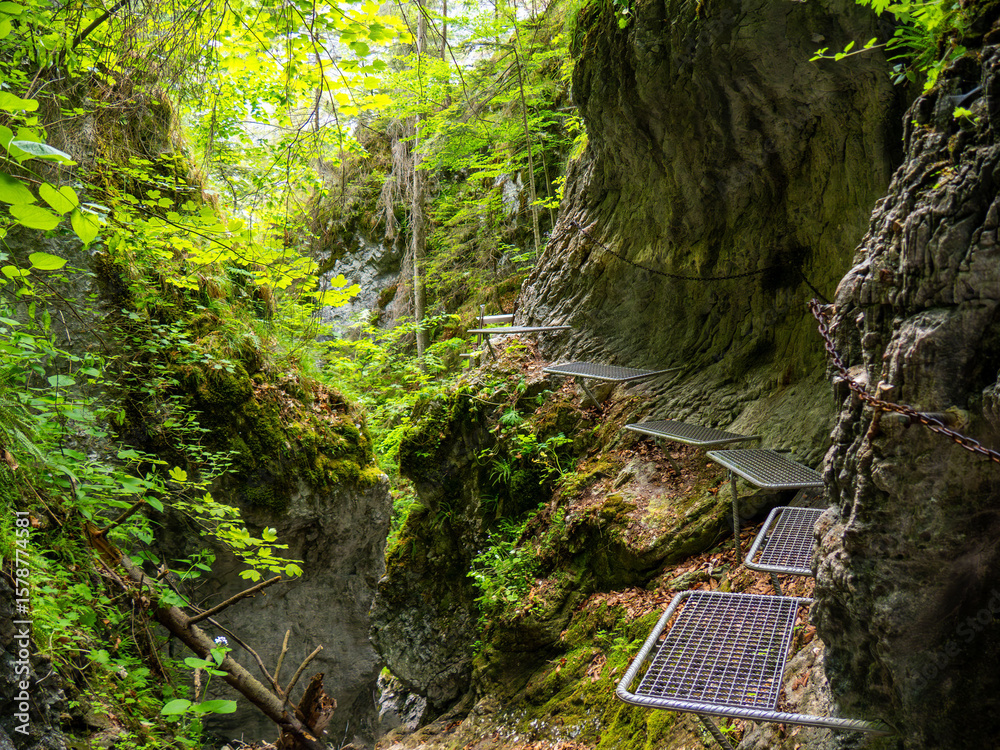 Metal grid steps via ferrata in Tatra mountain forest - Slovensky Raj Sucha Bela trail