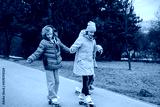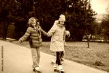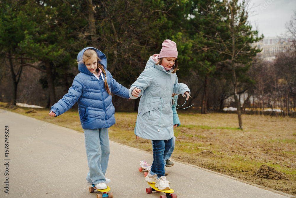Teen girls ride skateboards on city path in winter autumn park. Jackets and jeans reflect urban youth style. Street sport improves balance, movement, coordination, friendship and outdoor fun for kids