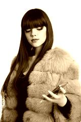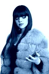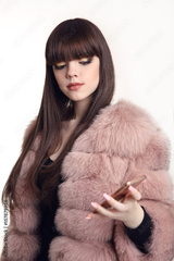 Fashion girl look in pink fur coat holding mobile phone isolated on white background. Trendy hairstyle. Brown haired.