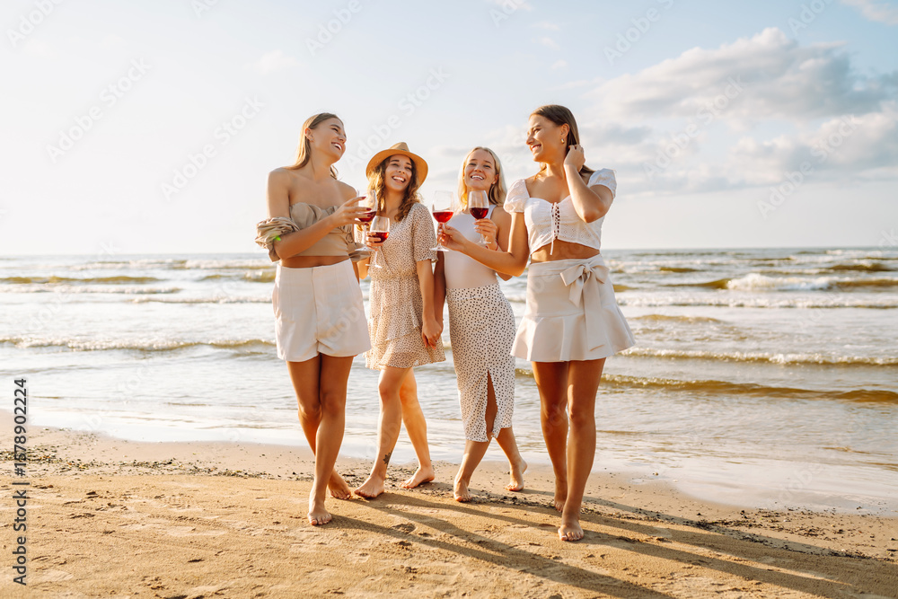 Young girlfriends standing with glasses of wine on the seashore and having fun outdoors. Four beautiful women spending time together, enjoying the weather and the holiday. Concept of beauty, holiday.