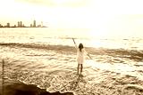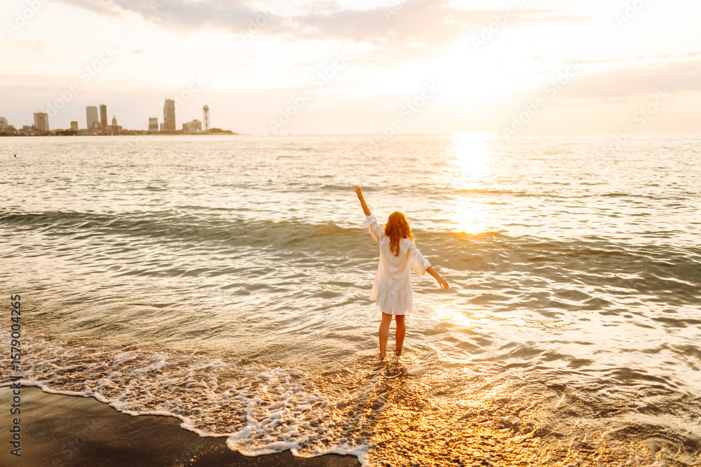 Cheerful woman in white dress enjoys sunset while walking along the seashore. Young woman feels freedom in the open air. Enjoyment, relaxation and weekend concept.